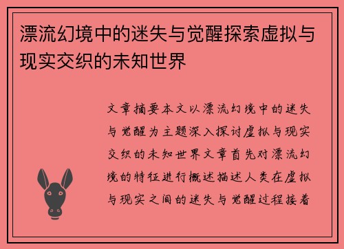 本文以漂流幻境中的迷失与觉醒为主题,深入探讨虚拟与现实交织的未知世界。文章首先对漂流幻境的特征进行概述,描述人类在虚拟与现实之间的迷失与觉醒过程。接着,文章从四个方面展开分析,分别为:虚拟世界的无限可能性与束缚、现实世界的存在困境与真实感知、迷失与觉醒的心理变化过程以及虚拟与现实交织中的道德与伦理冲突。通过对这些方面的详细阐述,本文揭示了虚拟与现实交融的深刻影响,探索了个体在两者之间如何寻找自我、重建认知与情感,最终达到一种新的心灵平衡与觉醒状态。最后,文章总结了虚拟与现实交织的未知世界对个体心理和社会伦理的挑战,并提出了未来可能的研究方向与应对策略。